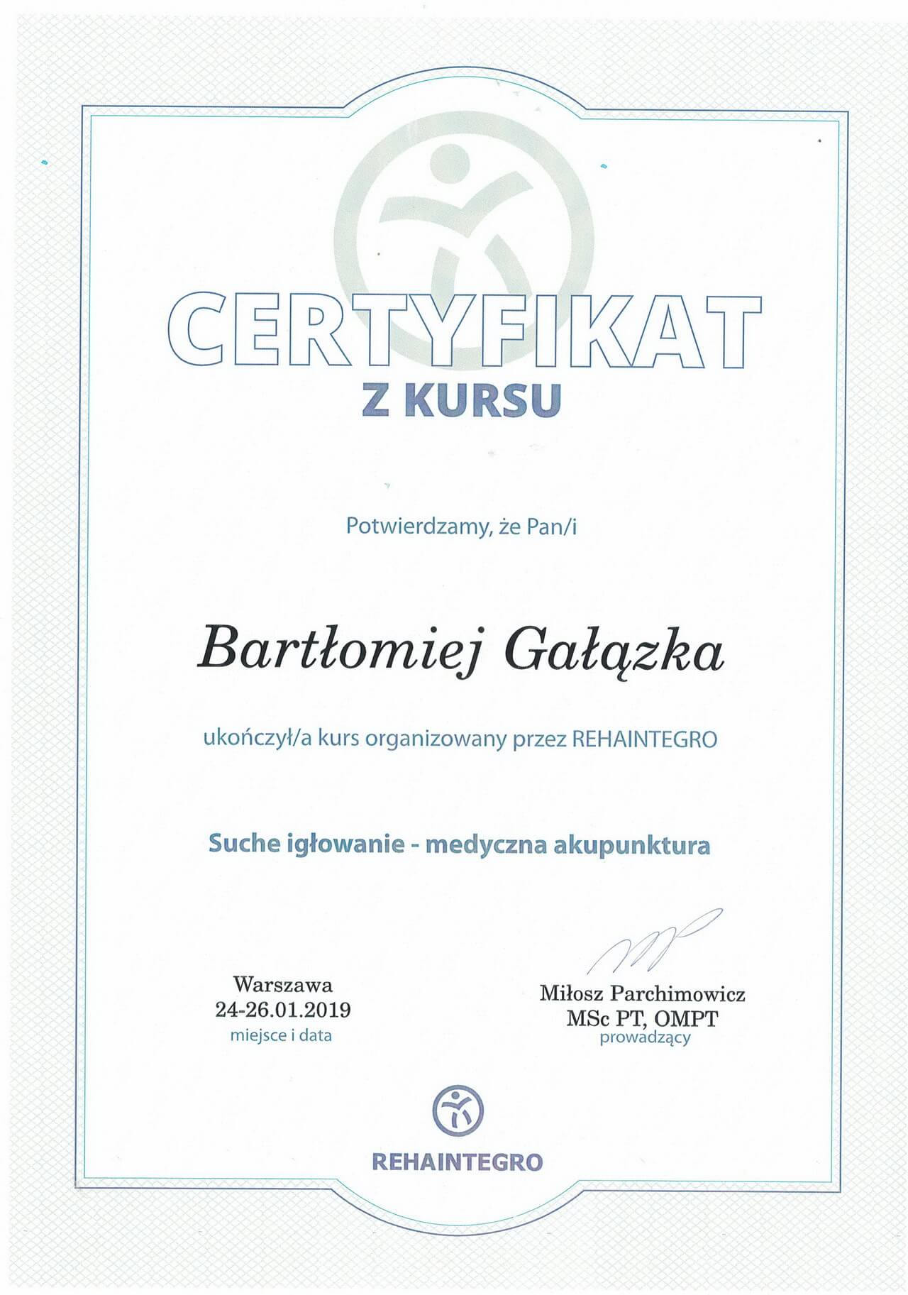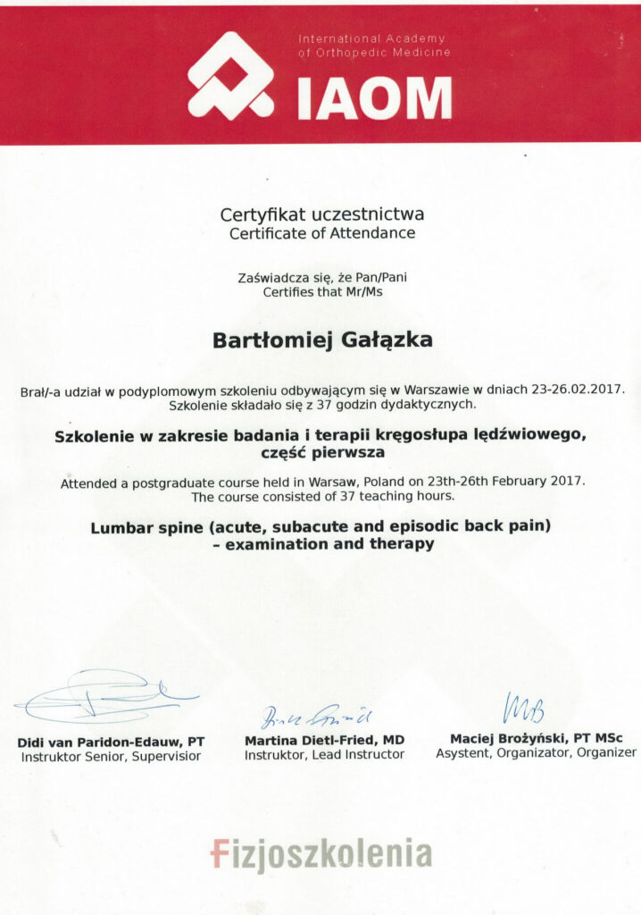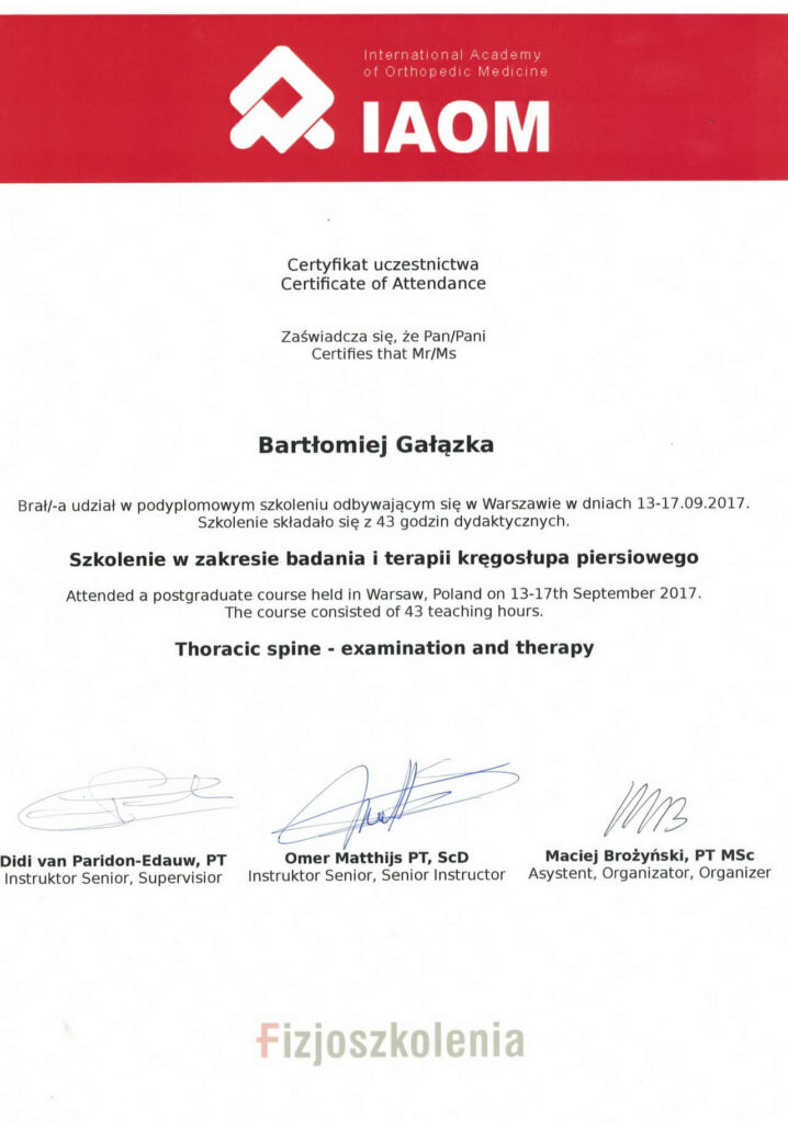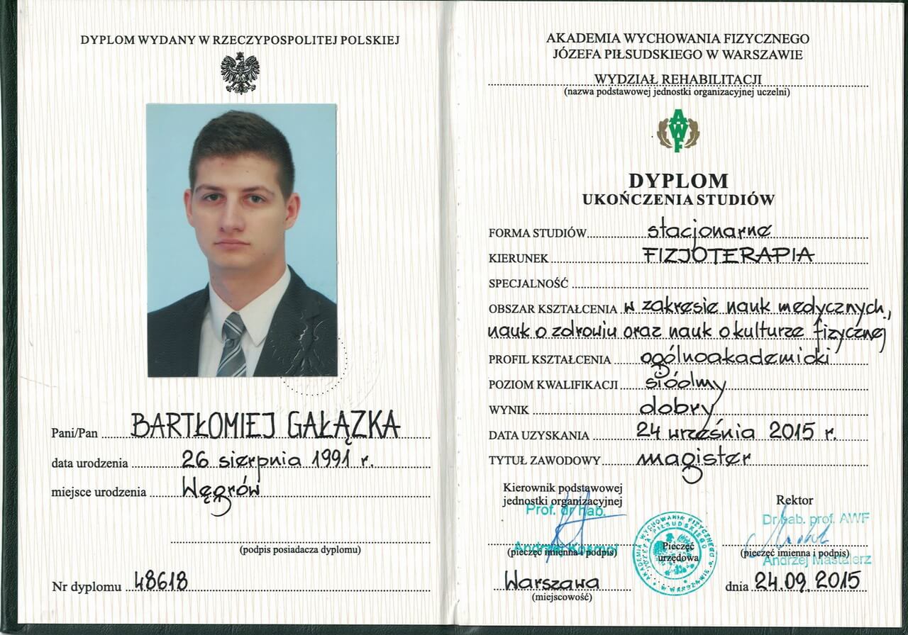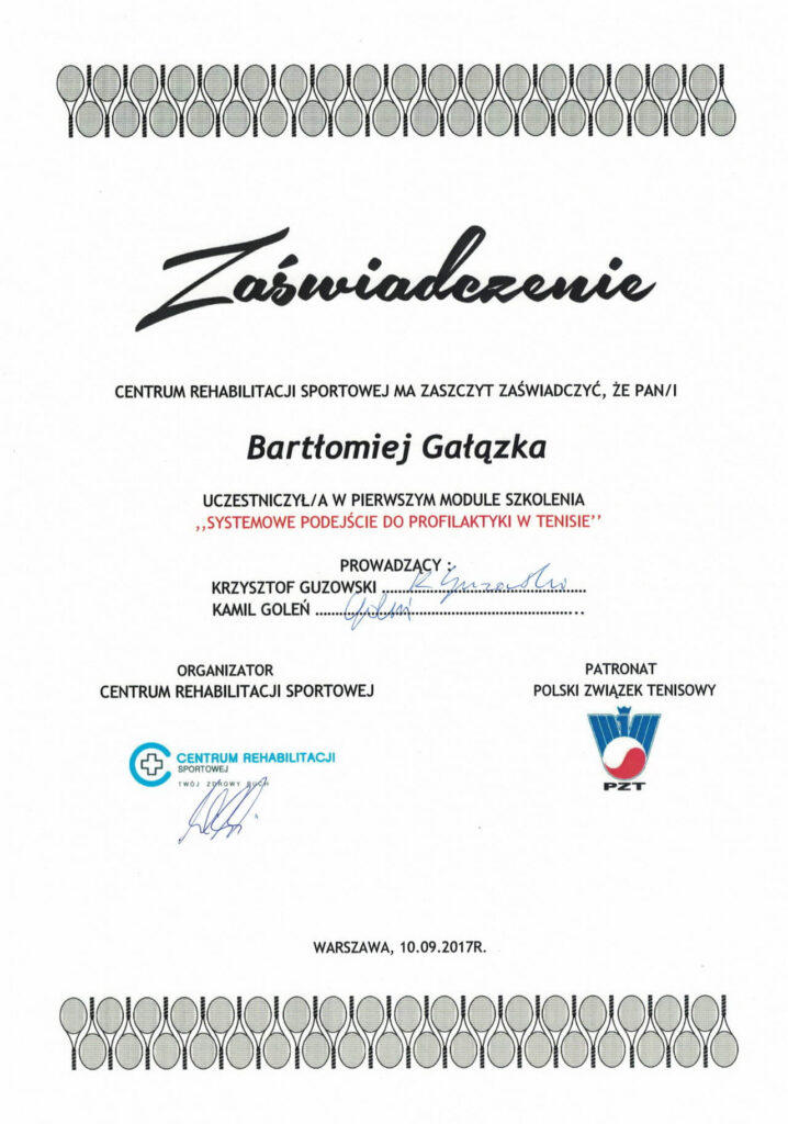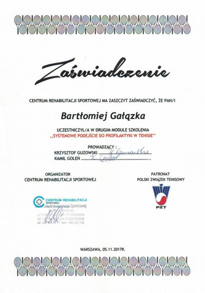 Magister fizjoterapii i absolwent Akademii Wychowania Fizycznego w Warszawie. Współwłaściciel Strefy Zdrowia. Ukończył liczne szkolenia z zakresu rehabilitacji ortopedycznej. Posiada certyfikaty ukończenia kursów terapii manualnej IAOM, pracy na tkankach miękkich oraz kinezjotapingu. Zajmuje się rehabilitacją zarówno zawodowych sportowców jak i amatorów aktywności fizycznej. Kontuzje i stany pourazowe to jego specjalność. Współpracował z Akademią Legii Warszawa, gdzie poszerzał umiejętności z zakresu rehabilitacji sportowej. Pasja i zaangażowanie sprawiają, że uczestniczy w licznych konferencjach dotyczących nowości z zakresu fizjoterapii. Zdobytą wiedzę i doświadczenie przekłada na odpowiednie techniki przy terapii z pacjentem.
