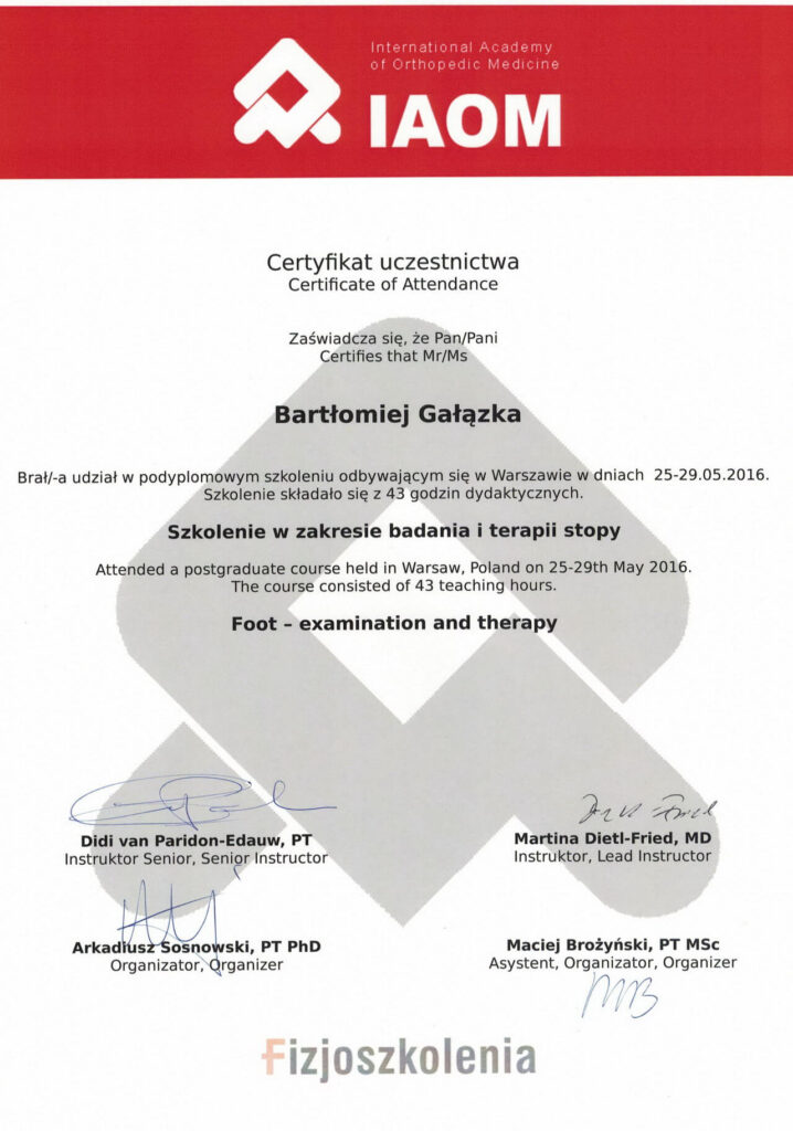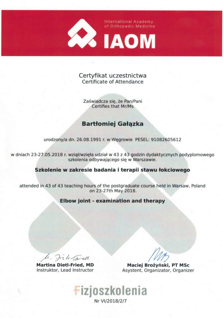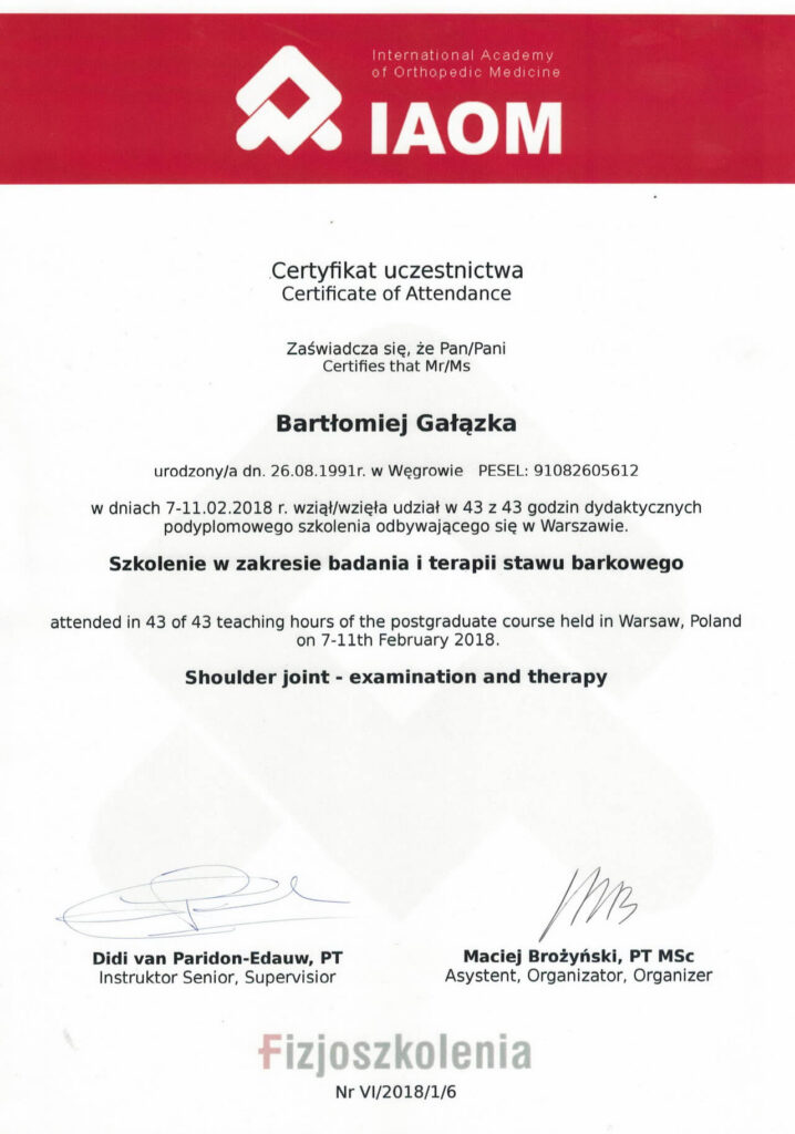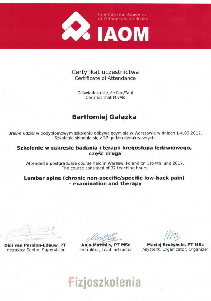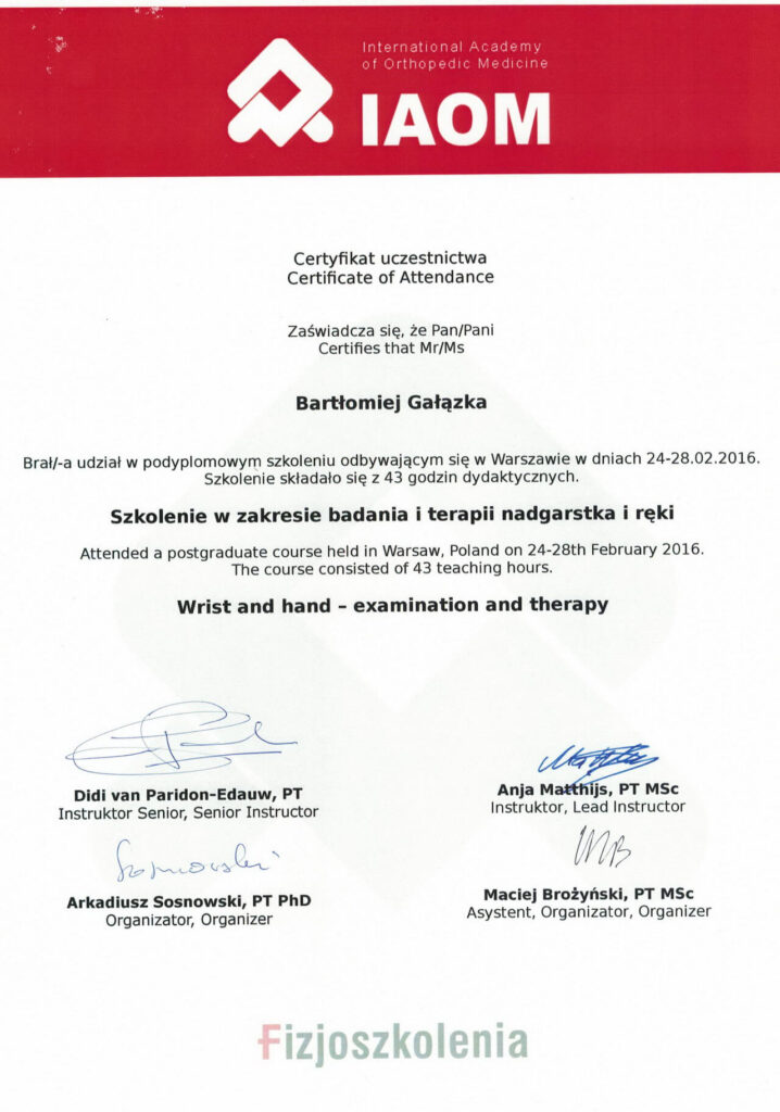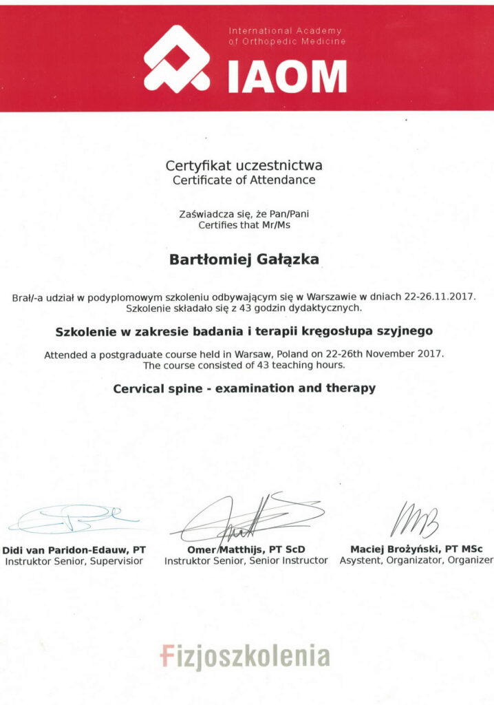 Magister fizjoterapii i absolwent Akademii Wychowania Fizycznego w Warszawie. Współwłaściciel Strefy Zdrowia. Ukończył liczne szkolenia z zakresu rehabilitacji ortopedycznej. Posiada certyfikaty ukończenia kursów terapii manualnej IAOM, pracy na tkankach miękkich oraz kinezjotapingu. Zajmuje się rehabilitacją zarówno zawodowych sportowców jak i amatorów aktywności fizycznej. Kontuzje i stany pourazowe to jego specjalność. Współpracował z Akademią Legii Warszawa, gdzie poszerzał umiejętności z zakresu rehabilitacji sportowej. Pasja i zaangażowanie sprawiają, że uczestniczy w licznych konferencjach dotyczących nowości z zakresu fizjoterapii. Zdobytą wiedzę i doświadczenie przekłada na odpowiednie techniki przy terapii z pacjentem.