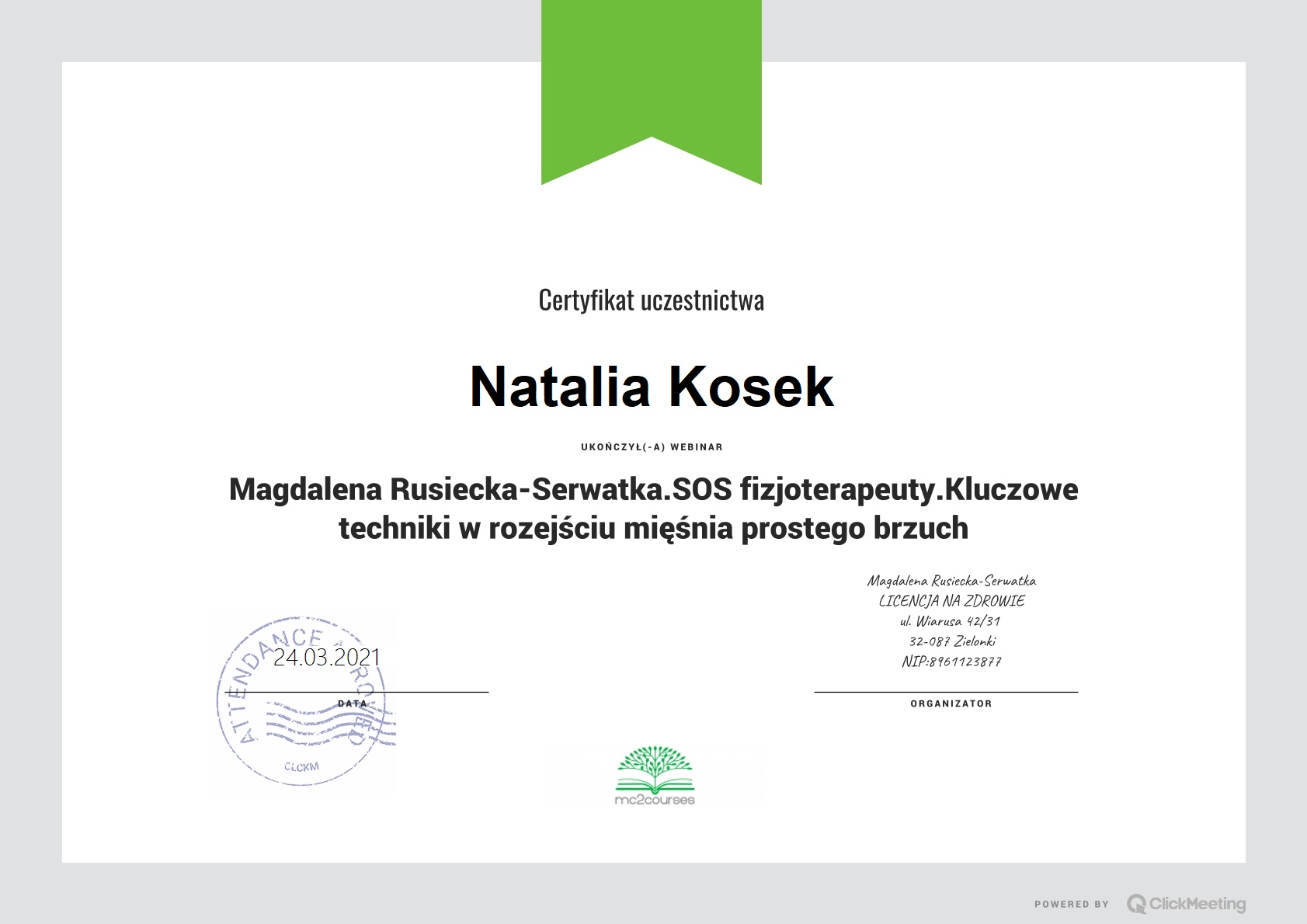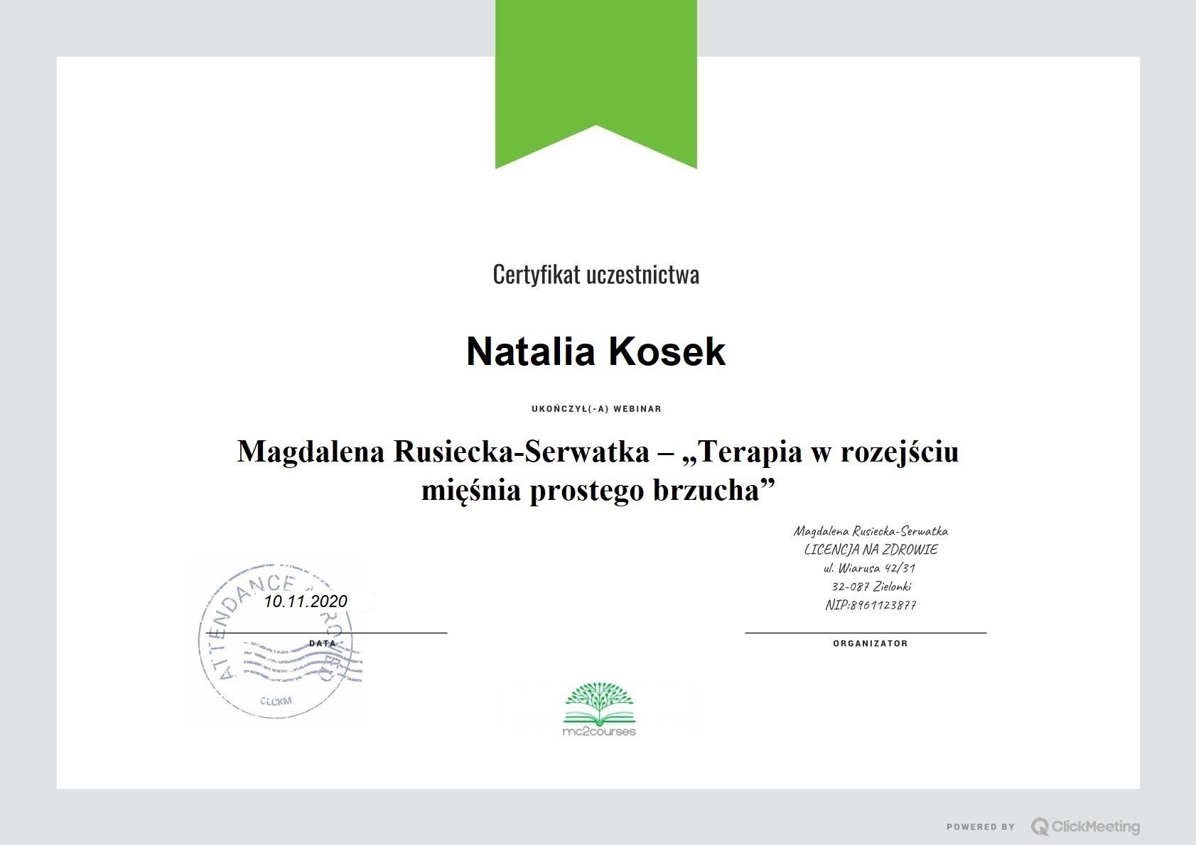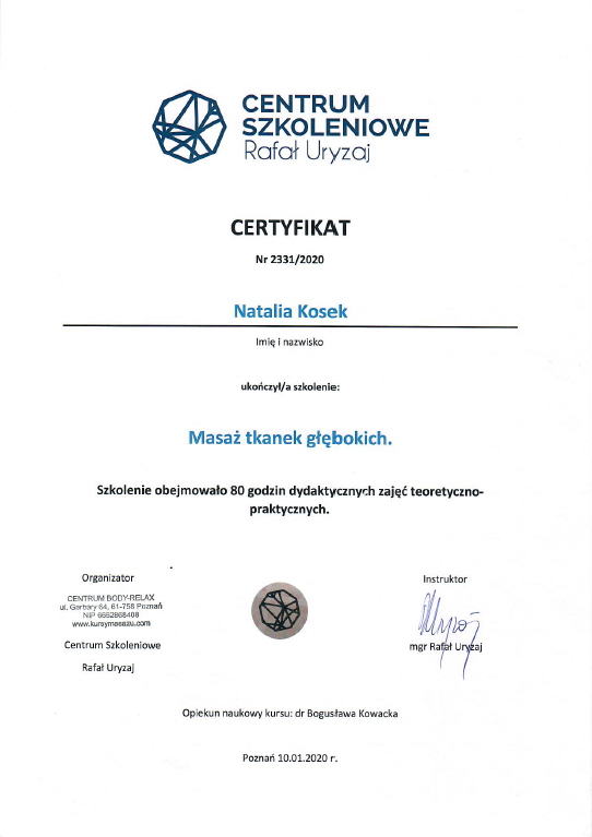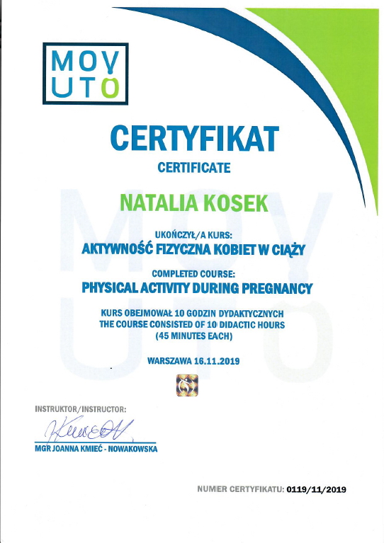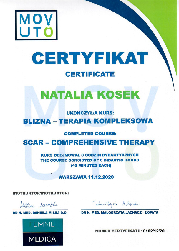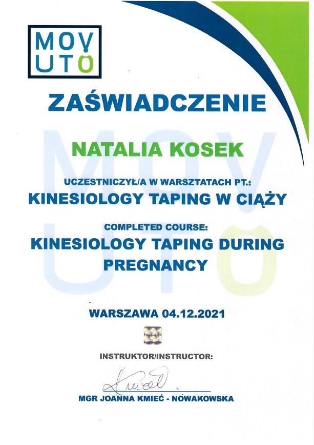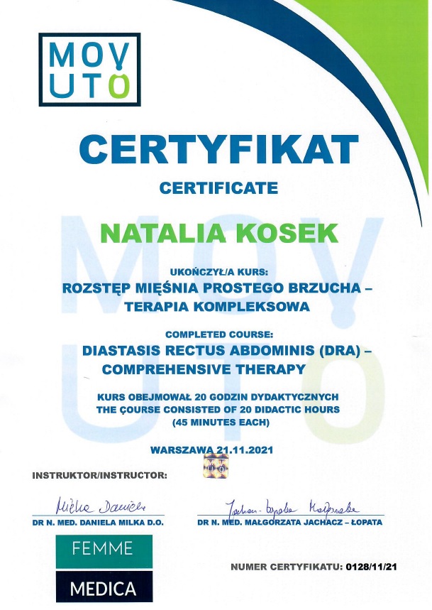 Magister fizjoterapii, absolwentka Warszawskiego Uniwersytetu Medycznego. Autorka warsztatu: “Zapobieganie rozejściu mięśnia prostego brzucha u kobiet w ciąży”. Swoje doświadczenie zdobywała w ośrodkach rehabilitacji ortopedycznej oraz neurologicznej. Ukończyła liczne kursy z zakresu masażu, jak również fizjoterapii uroginekologicznej. Zajmuję się kompleksowym przygotowaniem do porodu, a także pomaga wrócić swoim pacjentkom do sprawności po porodzie. Wielbicielka masażu Kobido, który z wielką przyjemnością wykonuje wśród swoich klientów. W swojej praktyce często spotyka się z pacjentkami z rozejściem mięśnia prostego brzucha oraz bliznami po cięciu cesarskim.