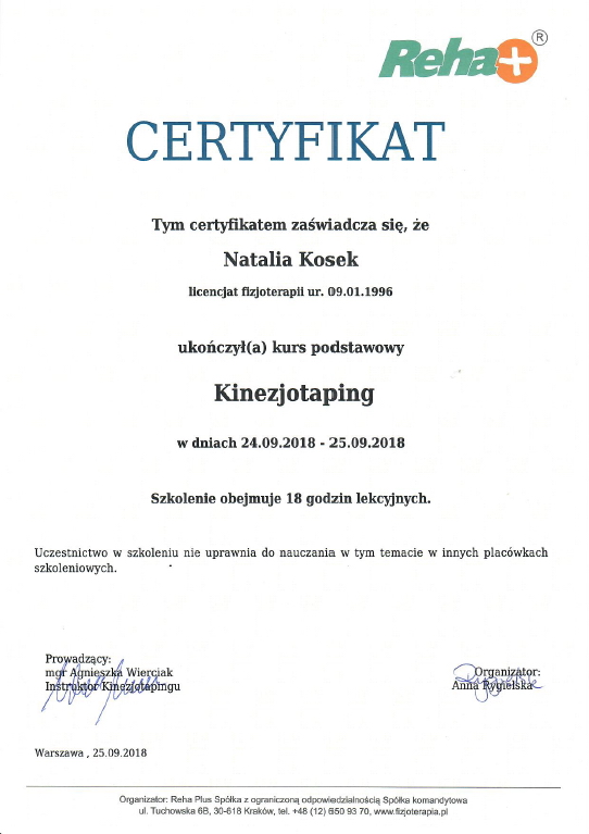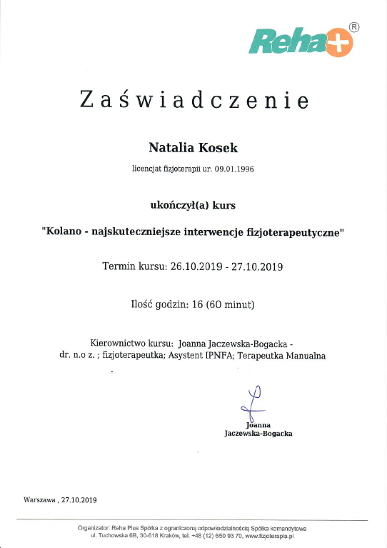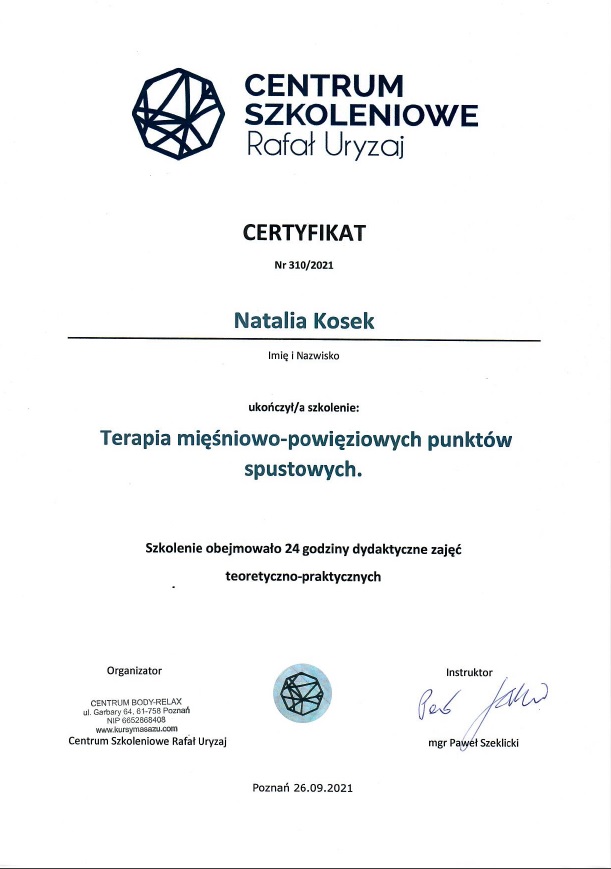 Stale poszerza swoją wiedzę i umiejętności z zakresu fizjoterapii, uczestnicząc w specjalistycznych kursach i szkoleniach. Stara się do każdego pacjenta podchodzić indywidualnie, aby jak najlepiej zrozumieć jego potrzeby. Prywatnie miłośniczka gotowania, podróży oraz aktywności fizycznej.