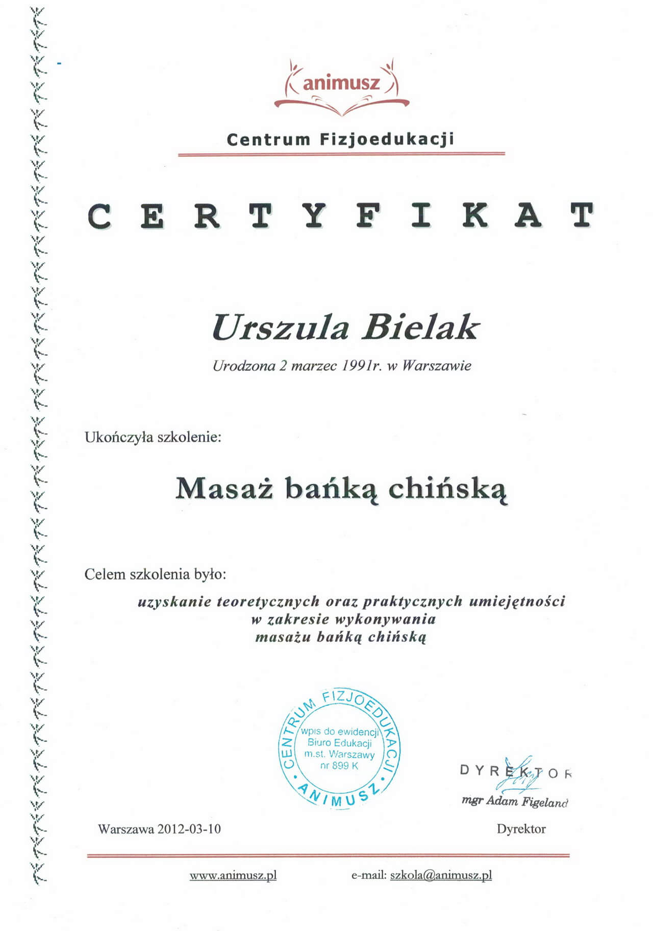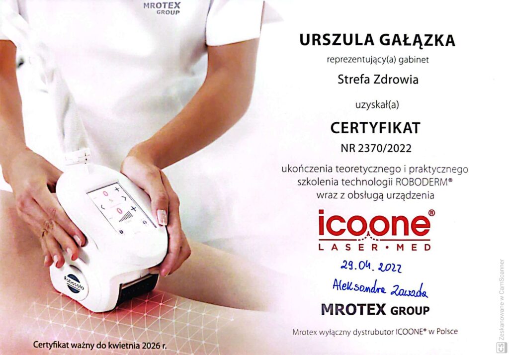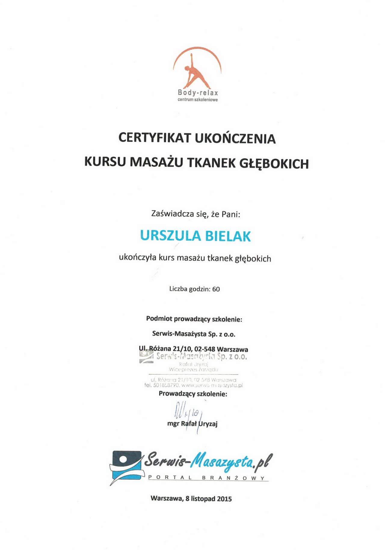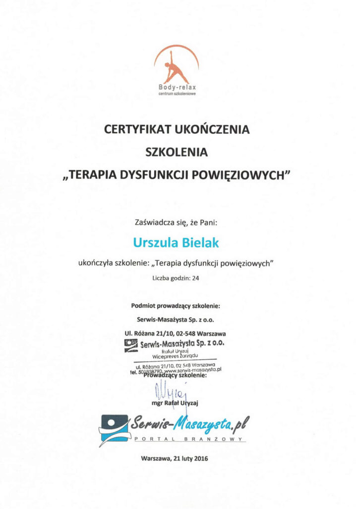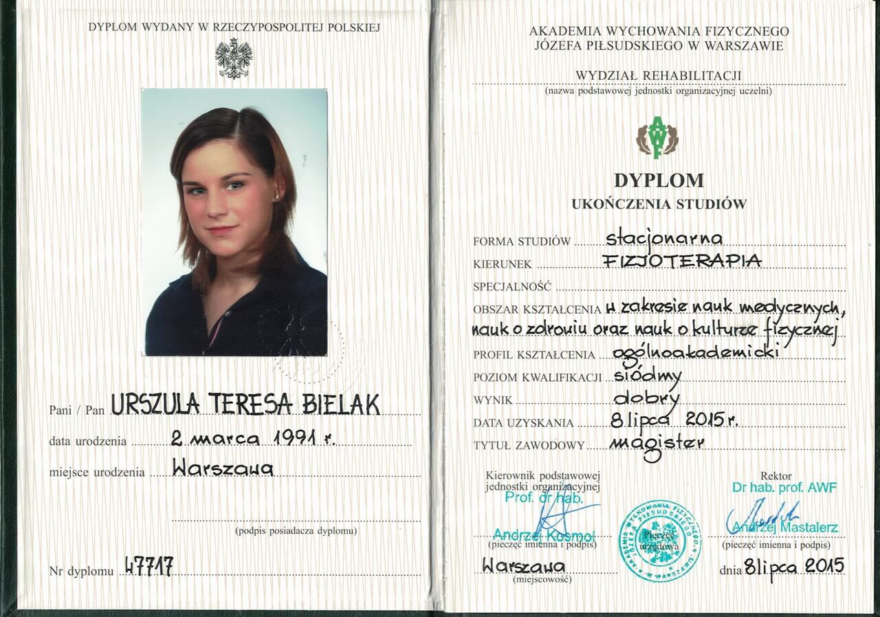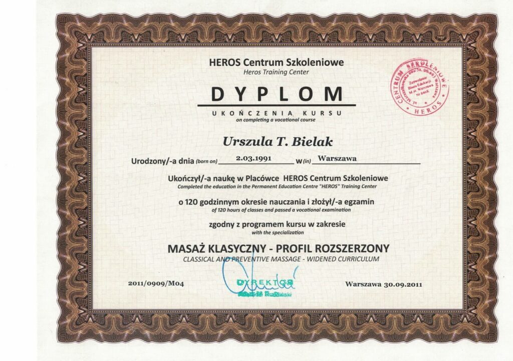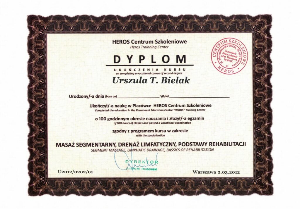 Magister fizjoterapii, absolwentka Akademii Wychowania Fizycznego w Warszawie oraz szkoły kosmetycznej w Warszawie. Współwłaścicielka Strefy Zdrowia. Ukończyła liczne kursy z zakresu masażu leczniczego i relaksacyjnego pogłębiając swoją wiedzę w tej dziedzinie. Dąży do poznania i zrozumienia oczekiwań klienta, dlatego też ciągle poszerza swoje umiejętności uczestnicząc w szkoleniach dotyczących specjalistycznych masaży dla kobiet w ciąży i okresie poporodowym, zabiegów wspomagających odchudzanie oraz modelujących sylwetkę. Jest właścicielką firmy BiuroOdnowa, specjalizującej się w masażach biurowych. Rozpowszechnia na polskim rynku znaną już na świecie metodę, krótkich, regeneracyjnych masaży dla pracowników uzupełnionych o gimnastykę w miejscu pracy oraz naukę zasad ergonomii. Z jej usług skorzystały już takie firmy jak: PLL LOT, IKEA, MERCEDES BENZ POLSKA, JUVENTUS, AON POLSKA oraz TPA HORWATH.