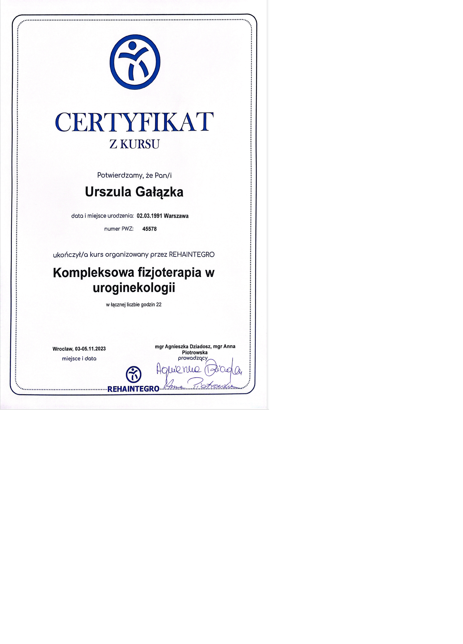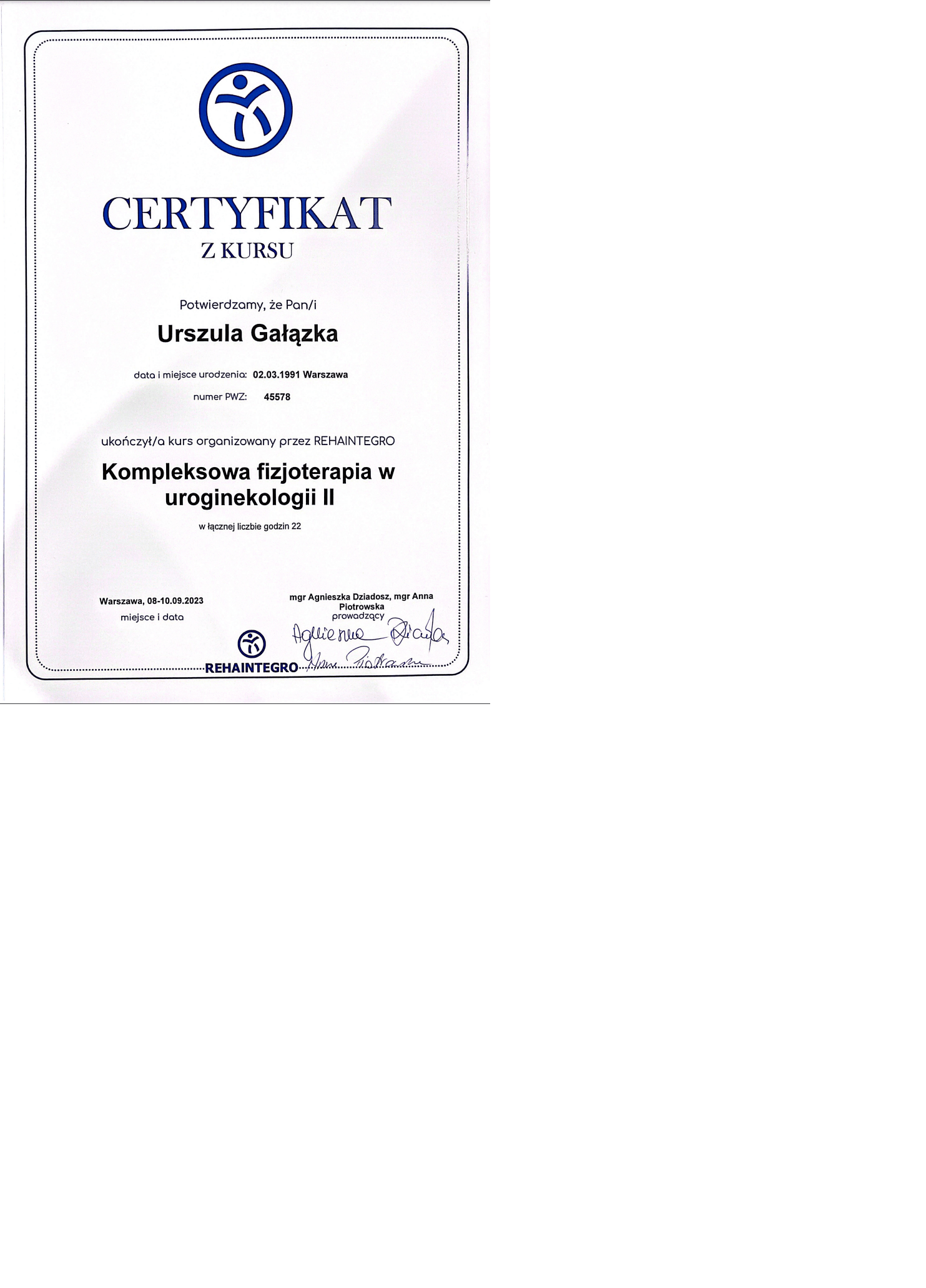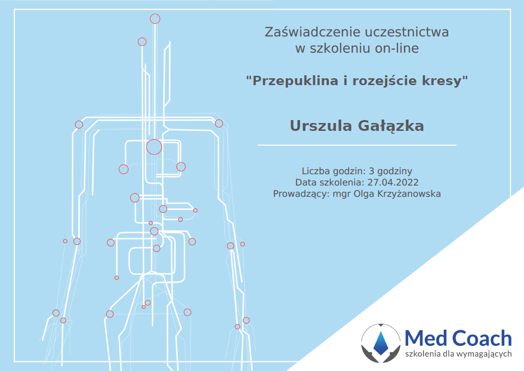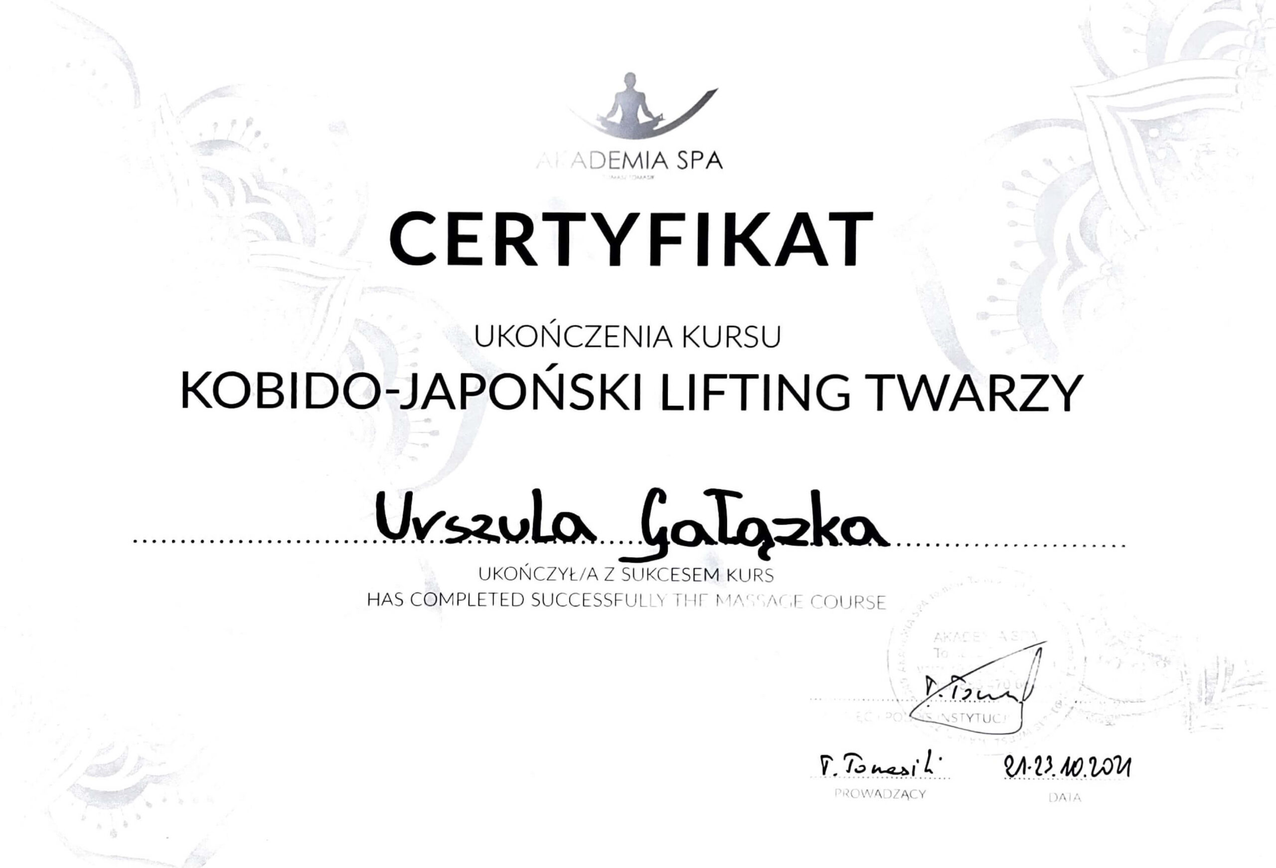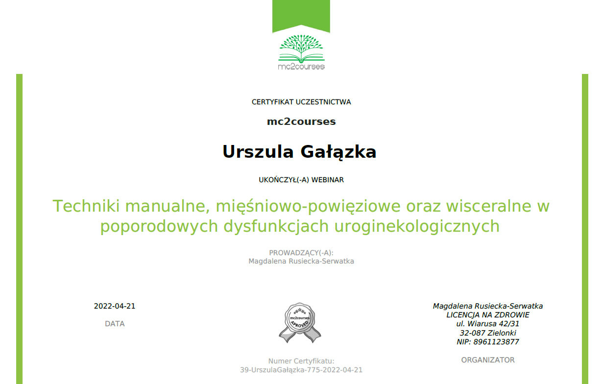 Magister fizjoterapii, absolwentka Akademii Wychowania Fizycznego w Warszawie oraz szkoły kosmetycznej w Warszawie. Współwłaścicielka Strefy Zdrowia. Ukończyła liczne kursy z zakresu masażu leczniczego i relaksacyjnego pogłębiając swoją wiedzę w tej dziedzinie. Dąży do poznania i zrozumienia oczekiwań klienta, dlatego też ciągle poszerza swoje umiejętności uczestnicząc w szkoleniach dotyczących specjalistycznych masaży dla kobiet w ciąży i okresie poporodowym, zabiegów wspomagających odchudzanie oraz modelujących sylwetkę. Jest właścicielką firmy BiuroOdnowa, specjalizującej się w masażach biurowych. Rozpowszechnia na polskim rynku znaną już na świecie metodę, krótkich, regeneracyjnych masaży dla pracowników uzupełnionych o gimnastykę w miejscu pracy oraz naukę zasad ergonomii. Z jej usług skorzystały już takie firmy jak: PLL LOT, IKEA, MERCEDES BENZ POLSKA, JUVENTUS, AON POLSKA oraz TPA HORWATH.