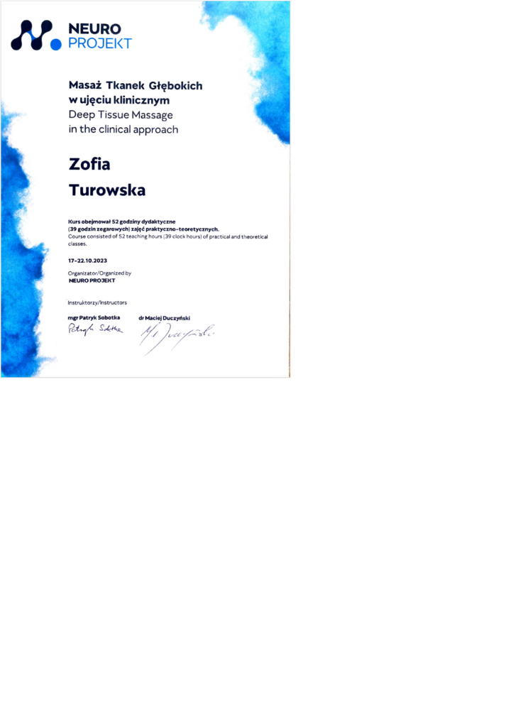 Studentka fizjoterapii na Akademii Wychowania Fizycznego Józefa Piłsudskiego w Warszawie. W pracy z pacjentem wykorzystuje techniki masażu tkanek głębokich, skupiając się na rozluźnieniu napięć w ciele.